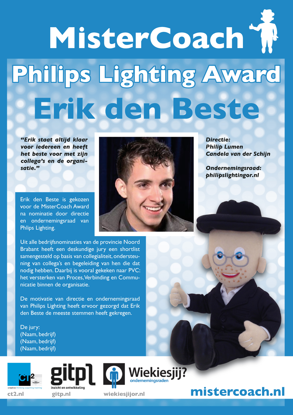 Dat moet u vooral niet zelf doen, dat zou teveel gewicht in de strijd gooien zijn. Dat laat u gewoon doen en het kost u slechts een evaluatiegesprek. Voor dit soort huldigingen, schouderkloppen en complimenten is er nu de MisterCoach Award. Let wel, de lat ligt best hoog. We komen niet zomaar. Directie en OR worden van harte uitgenodigd om middels het daarvoor bestemde aanmeldformulier hun topper op te geven, voorzien van een gedegen motivatie.
